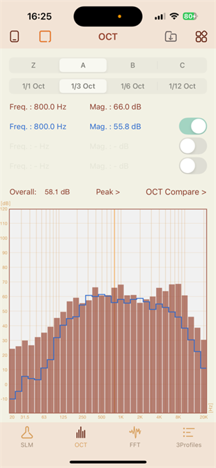 ? 倍頻程分析模式(OCT):支持 1/1、1/3、1/6、1/12 倍頻程分析,實(shí)時(shí)顯示 20Hz-20kHz 各頻段聲壓級(jí),支持頻譜的能量平均及最大值保持,可對(duì)比最多 3 組歷史測(cè)試數(shù)據(jù)
