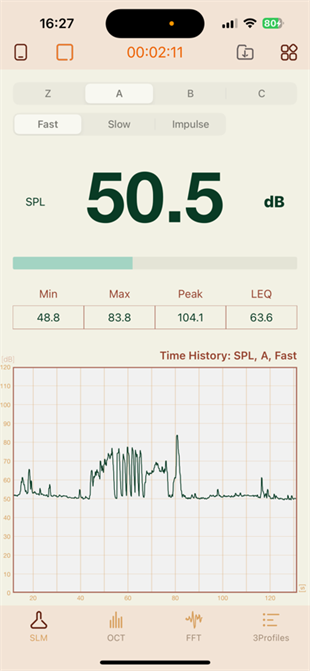 ? 基礎(chǔ)聲級(jí)計(jì)模式(SPL):實(shí)時(shí)測(cè)量 SPL,同步監(jiān)測(cè) MAX、MIN、PEAK、RMS、LEQ 參數(shù);實(shí)時(shí)切換頻率計(jì)權(quán)(A、B、C、Z)與時(shí)間檢波(快檔、慢檔、脈沖檔)