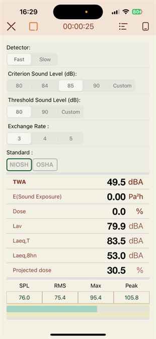 ? 支持 NIOSH/OSHA 標(biāo)準(zhǔn),也可自行設(shè)置標(biāo)準(zhǔn)聲級(jí) Lt(90、85、84、80 或自定義)、閾值聲級(jí) Lc(90、80、自定義)及交換率 q(3、4、5)