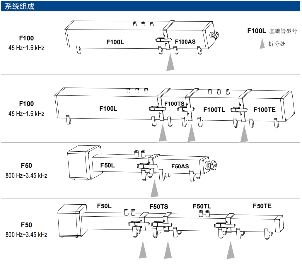 F 系列的阻抗管系統(tǒng)適用于雙傳聲器傳遞函數(shù)法,僅需一次測(cè)試即可獲得全測(cè)量頻率范圍內(nèi)的材料法向吸聲系數(shù)和聲阻抗率,相較于基于駐波比法設(shè)計(jì)的駐波管,顯著提升了材料聲學(xué)特性的測(cè)試效率。而傳遞損失管系統(tǒng)適用于四傳聲器傳遞函數(shù)法,通過測(cè)量四個(gè)固定點(diǎn)在不同末端狀態(tài)下的聲壓級(jí),解析復(fù)傳遞函數(shù),即可求得待測(cè)材料的傳遞損失。