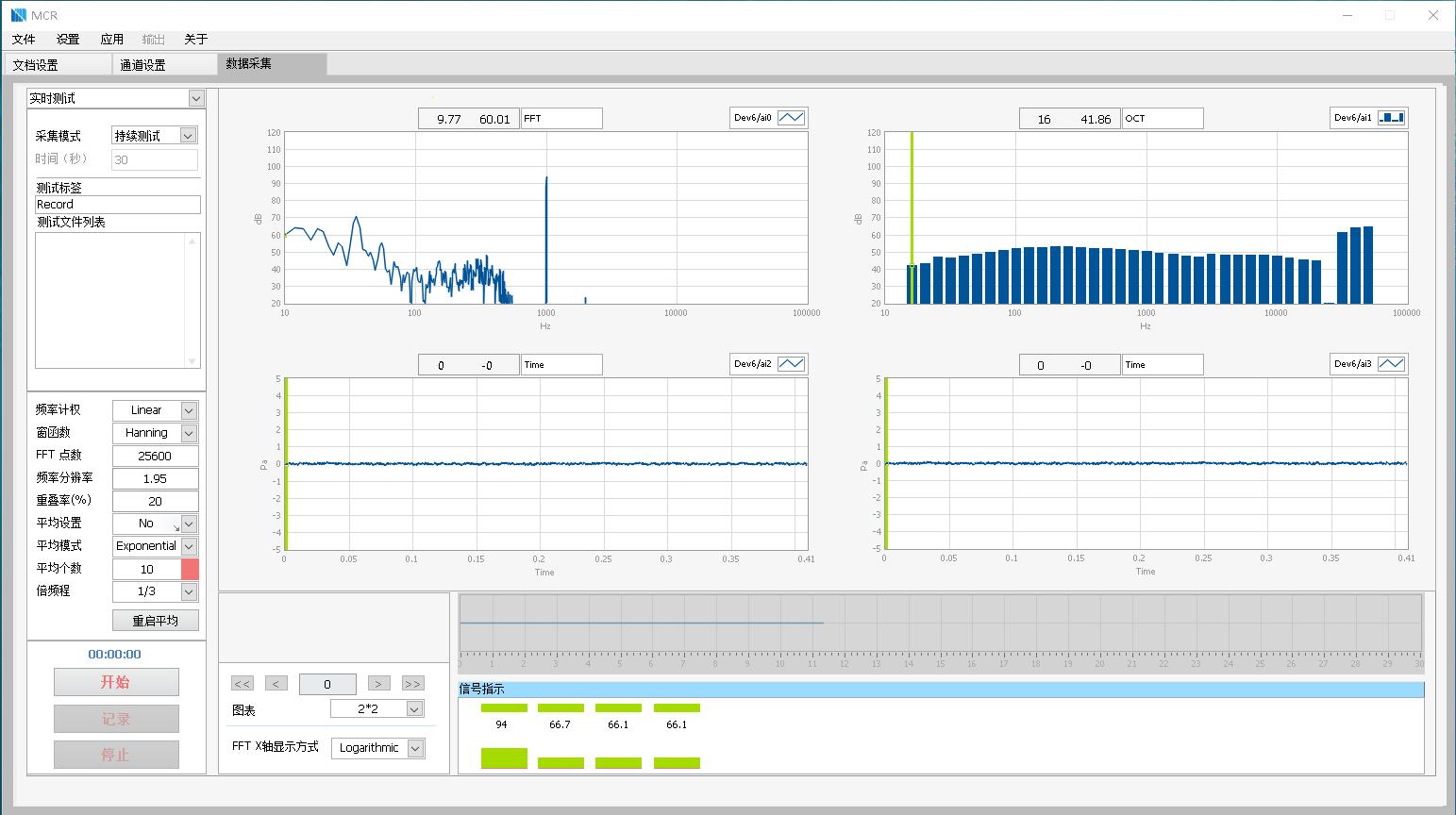 數(shù)據(jù)采集界面,信號(hào)狀態(tài)顯示,信號(hào)強(qiáng)弱和過載指示,FFT,Octave等分析