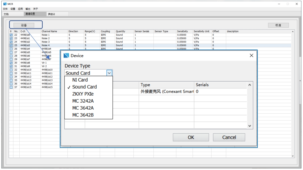 軟件通道設(shè)置界面,支持多種測試硬件,支持多種物理量測量,各通道可校準(zhǔn)